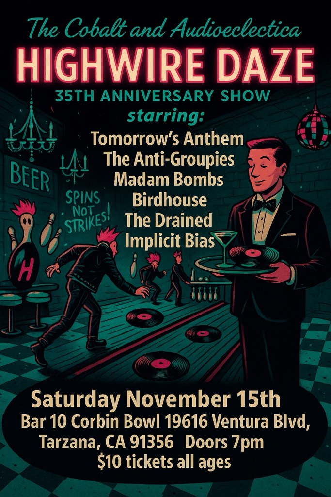 If you have never been to a Cobalt Presents show you absolutely have to!! These shows are (currently) being held at Corbin Bowl in Tarzana and Hotel Ziggy in West Hollywood. The show that was held at Corbin on November 15th 2025 was the 35th Anniversary of Highwire Daze Magazine. There were six great local/young bands so with that, let’s